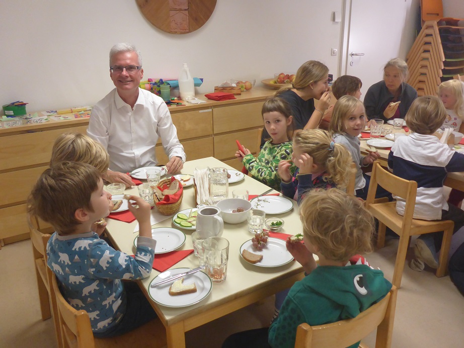 Herr Pröglhöf gestaltete mit uns einen kurzen Gottesdienst. Unsere Vorschulkinder hatten ein Gedicht vorbereitet und wir sangen gemeinsam einige Lieder. Im Anschluss durfte natürlich eine gesunde, gemeinsame Jause nicht fehlen.