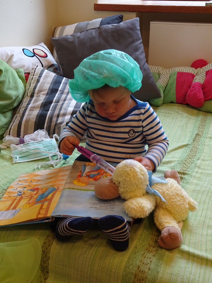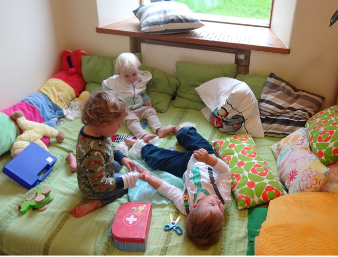 Derzeit beschäftigen sich die Kinder sehr intensiv mit Verletzungen und wie man sie gut versorgt. Dabei schlüpfen sie in unterschiedliche Rollen, beispielsweise ÄrztIn oder PatientIn. Behutsam kümmern die Kinder sich um Mensch und Tier, wobei jeder Verletzung Beachtung geschenkt und alles gut versorgt wird. Neben der Fürsorglichkeit füreinander lernen sie Verbandsmaterialien und den Umgang damit kennen.