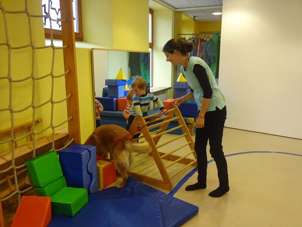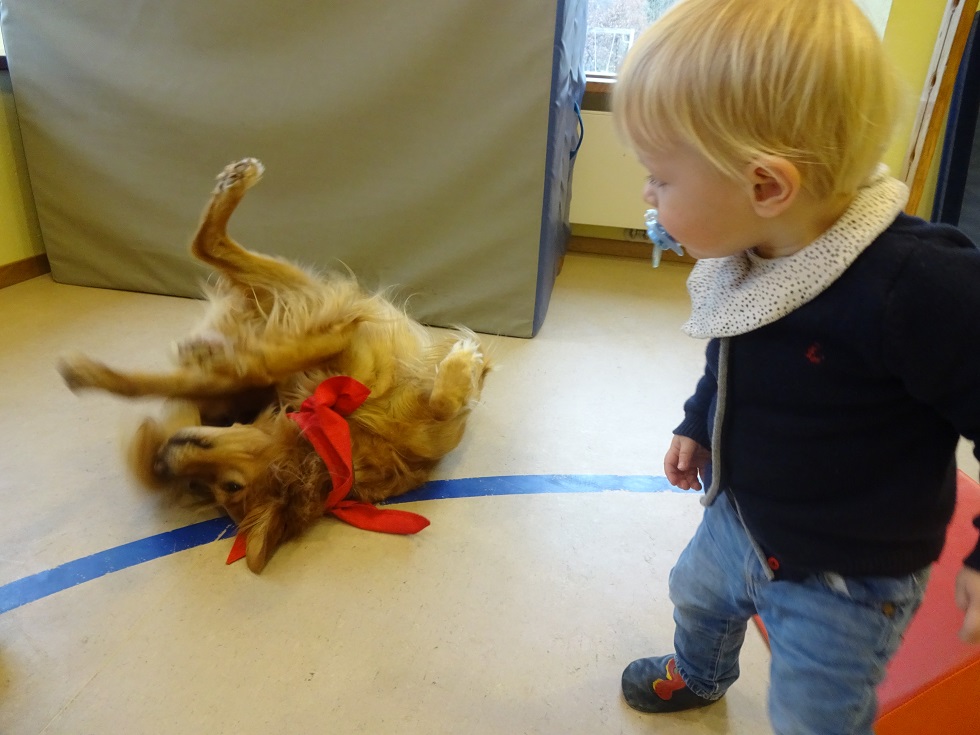 Vorrangig sind die Begegnungen mit dem Hund in einer sicheren Umgebung. Die Kinder beobachten mit Interesse die unterschiedlichen Bewegungen und Ausdrucksweisen des Hundes.