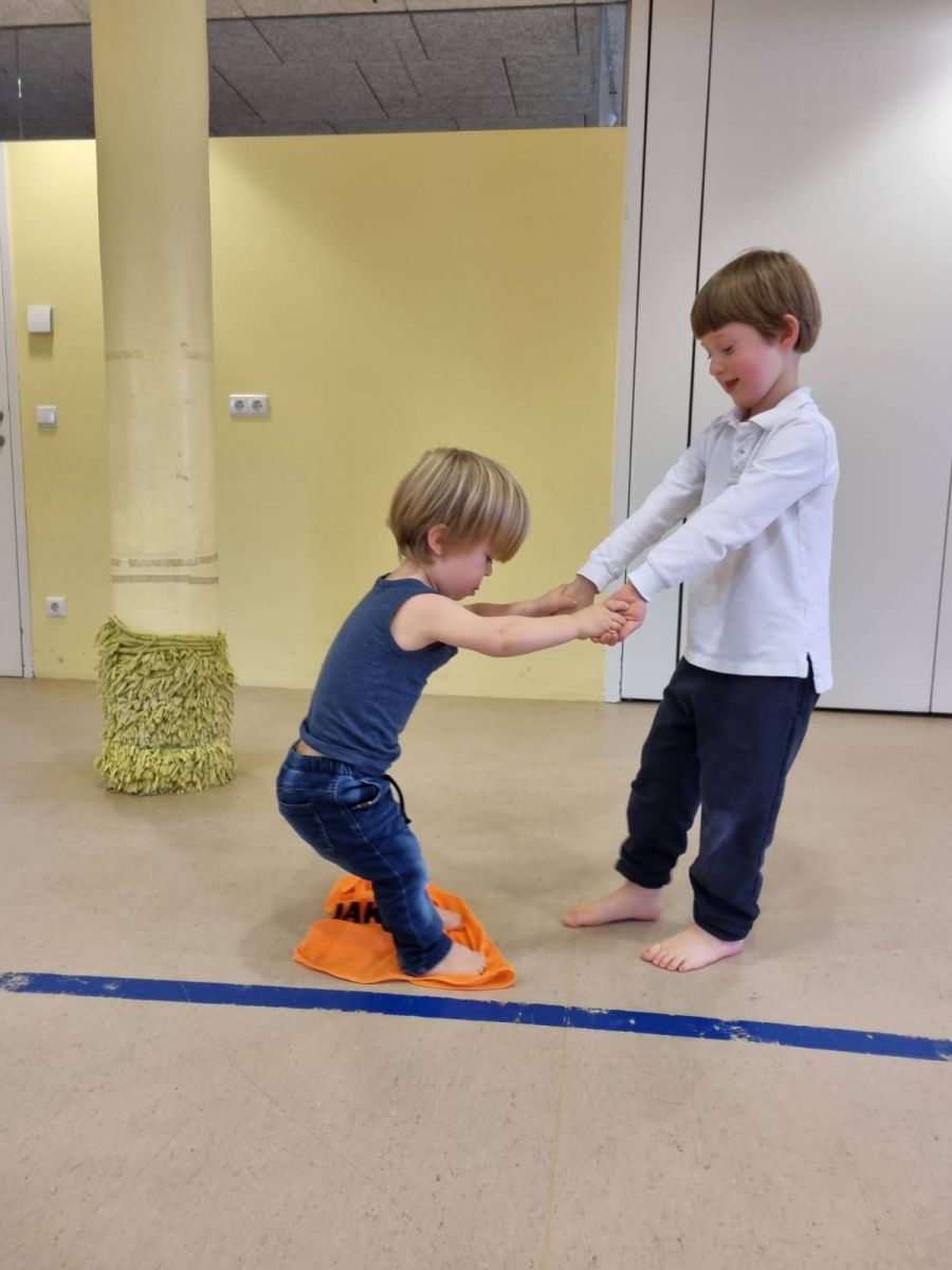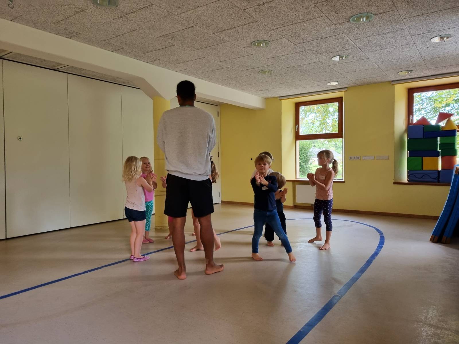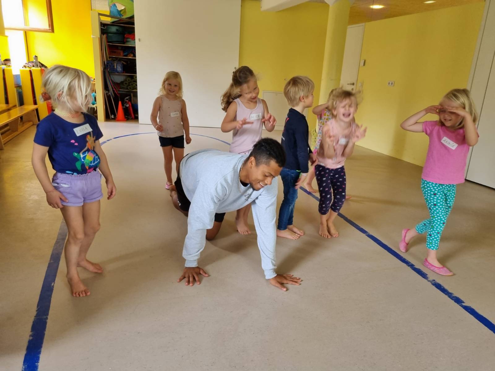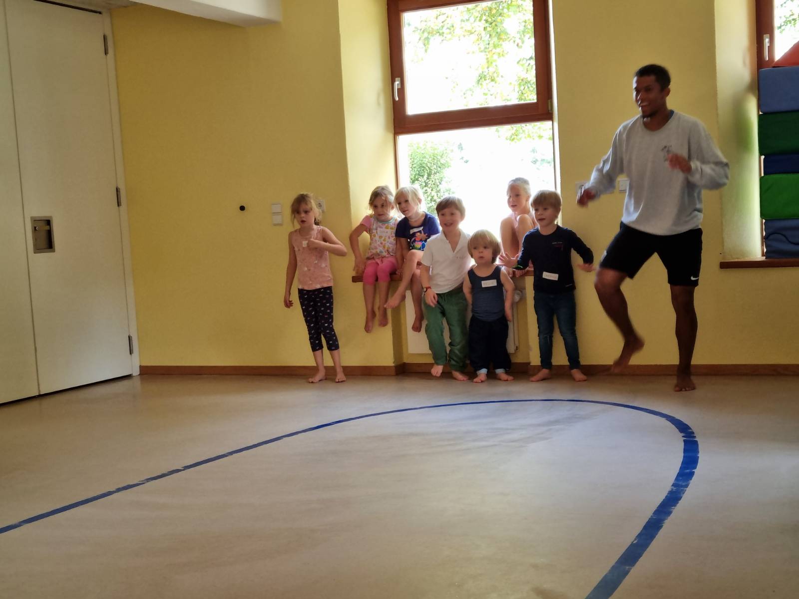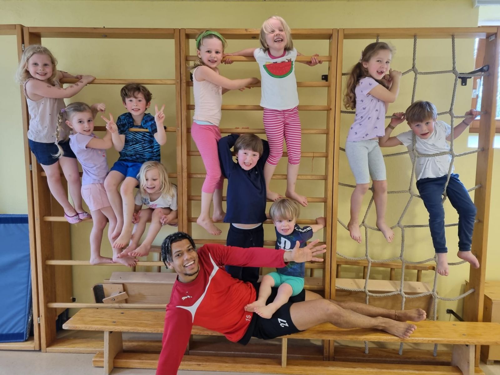 Seit dem vergangenen Kindergartenjahr nehmen wir an dem Pilotprojekt „Tägliche Bewegungseinheit“ teil. Bewegung ist ein Grundbedürfnis unserer Kinder und wirkt sich vielfältig positiv auf die Gesundheit und Entwicklung der Heranwachsenden aus. Neben vielen Aktionen, die wir als Pädagoginnen im Alltag immer wieder umsetzen, besucht uns jeden Donnerstag unser Sporttrainer Yannick um eine gezielte Bewegungseinheit von einer Stunde mit den Kindern durchzuführen. Dann wird im Turnsaal getobt und gelaufen, unsere Klettergeräte werden aufgebaut. Für unsere Kindergartengruppe hat der Donnerstag daher immer wieder eine besondere Bedeutung. Wir freuen uns, dass das Projekt auch dieses Jahr noch fortgeführt wird.