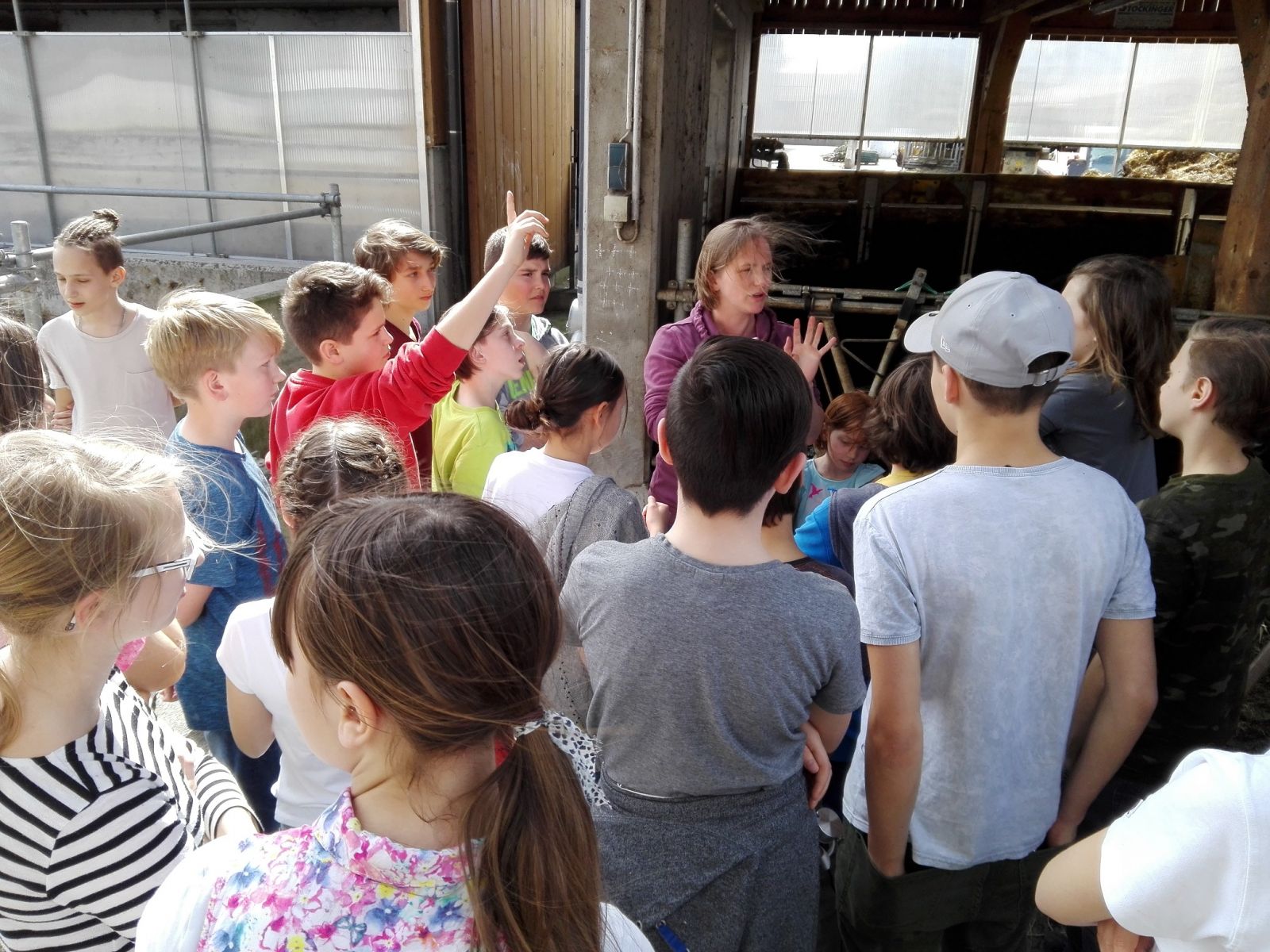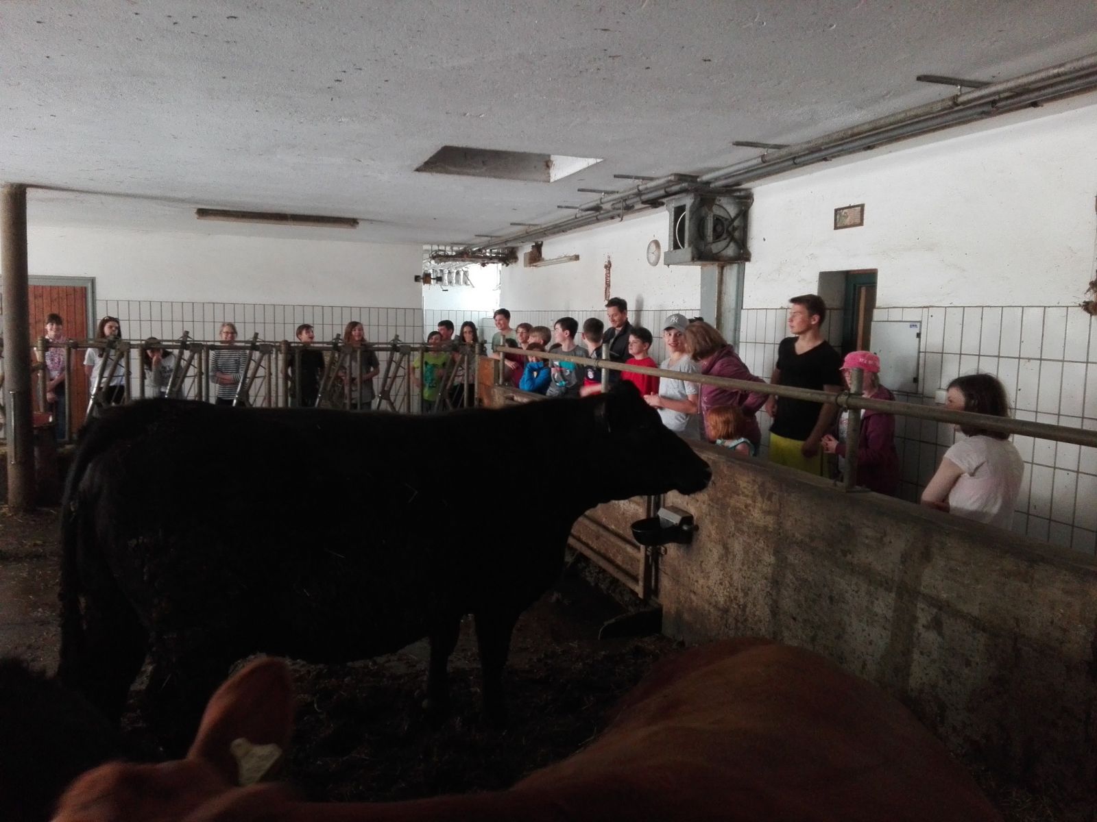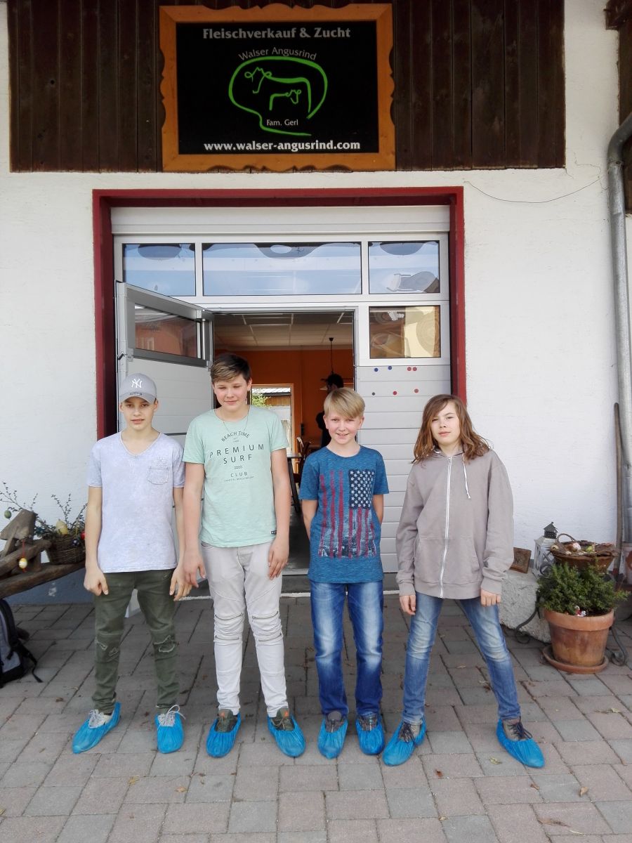 Frau Gerl, eine ehemalige Kindergartenpädagogin, führte die Klasse ca. 1,5 Stunden über ihren Hof und erzählte Spannendes über den Alltag einer Bäuerin. Sie setzt auf die Mutterkuhhaltung, bei der die Kälber möglichst lange bei ihrer Mama bleiben dürfen. Jede Kuh wurde von ihr mit Namen angesprochen, was ihre Wertschätzung gegenüber den Tieren sichtbar machte. Nichts desto trotz, werden die Kälber mit ca. 20 Monaten vom Schlachter geholt, welcher die Tiere einige Tage später in, wie Frau Gerl dies beschrieb, frauenfreundlichen Stücken zurückbringt. Verarbeitet wird das Tier dann frisch am Hof zu diversen Fleisch- und Wurstwaren, die sich bei Einheimischen großer Beliebtheit erfreuen. Wer einen Lungenbraten möchte, muss diesen 3 Jahre im Voraus reservieren – na bitte!