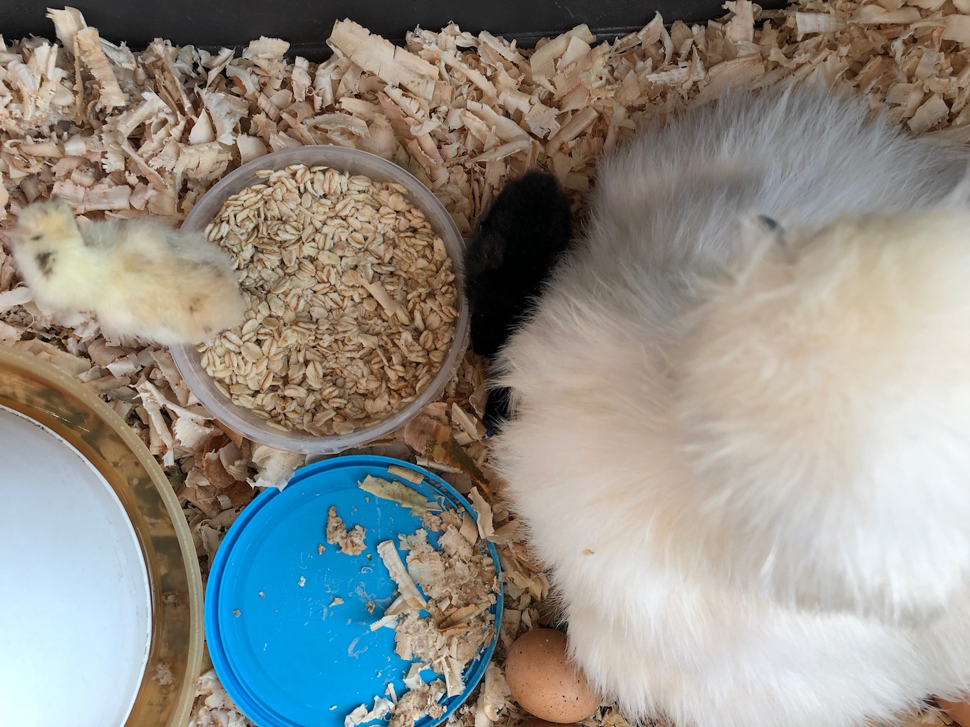Nach 23 Tagen, am 12. Oktober, als wir von unserem „Waldtag“ zurückkehrten, war das erste Küken geschlüpft. Es ist schwarz. Am Sonntag schlüpfte ein gelbes und am Montag ein weiteres schwarzes.