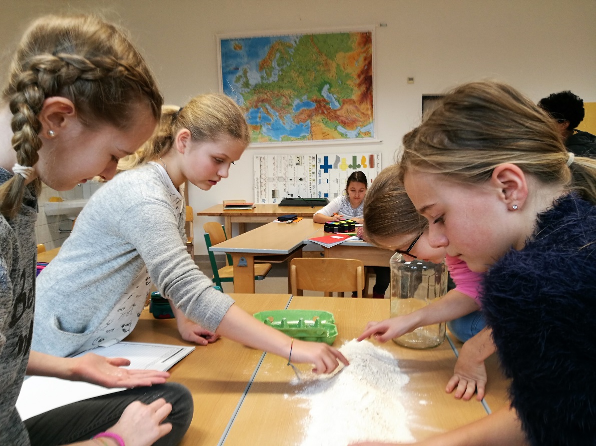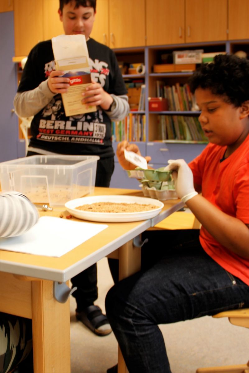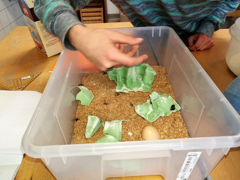 Einmal pro Woche wurden die Larven gezählt, später auch die Puppen (Nymphen) und schließlich auch die ersten Käfer (Imagos). Die Eier waren zu klein zum Zählen, aber unter dem Mikroskop entdeckte schließlich eine Schülerin ein Objekt, das nur ein Ei sein konnte