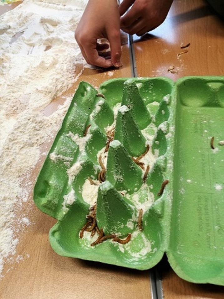 Mittlerweile wimmelt es von kleinen Larven, hochgerechnet sind es 700 und vielleicht gibt es auch bald eine Verköstigung, so wie seinerzeit im Februar, als es welche in Schokolade und andere pikant gewürzt gab.