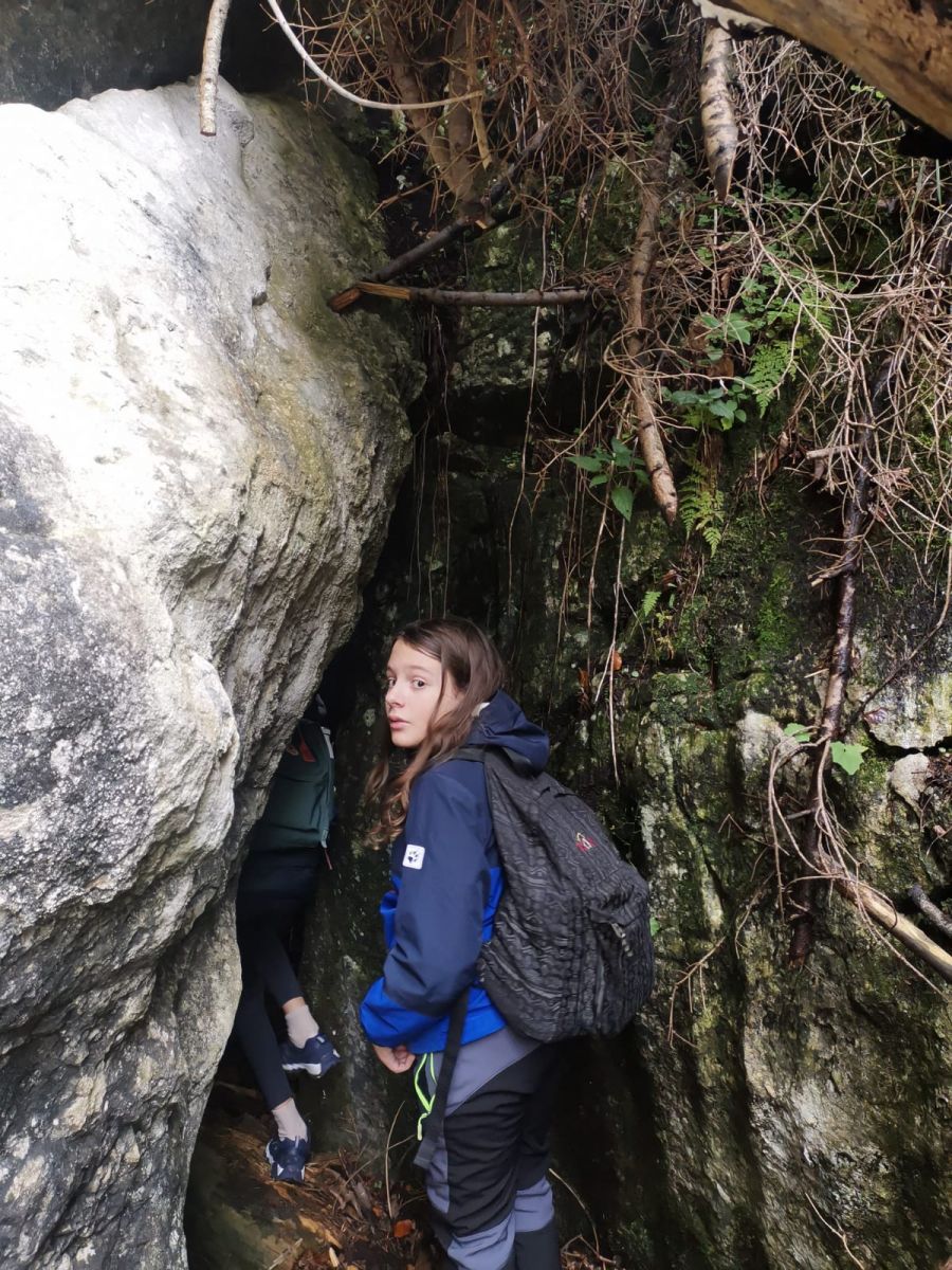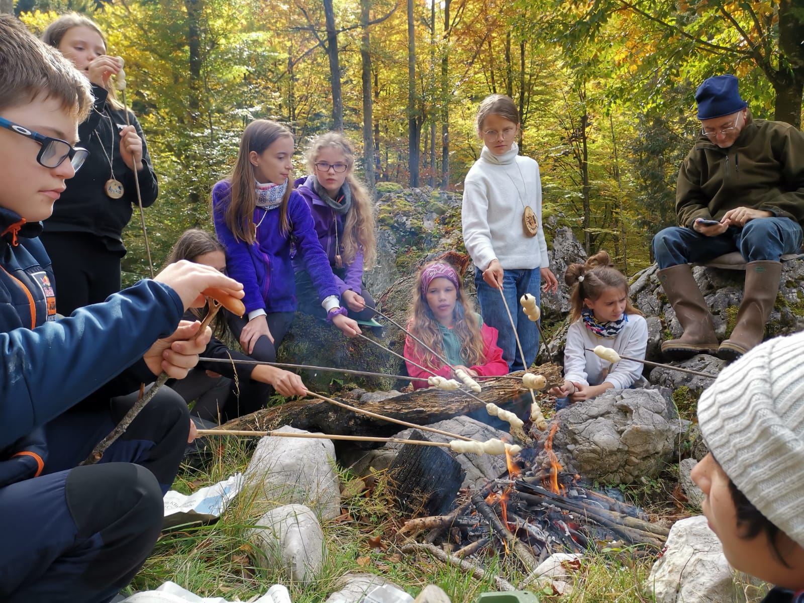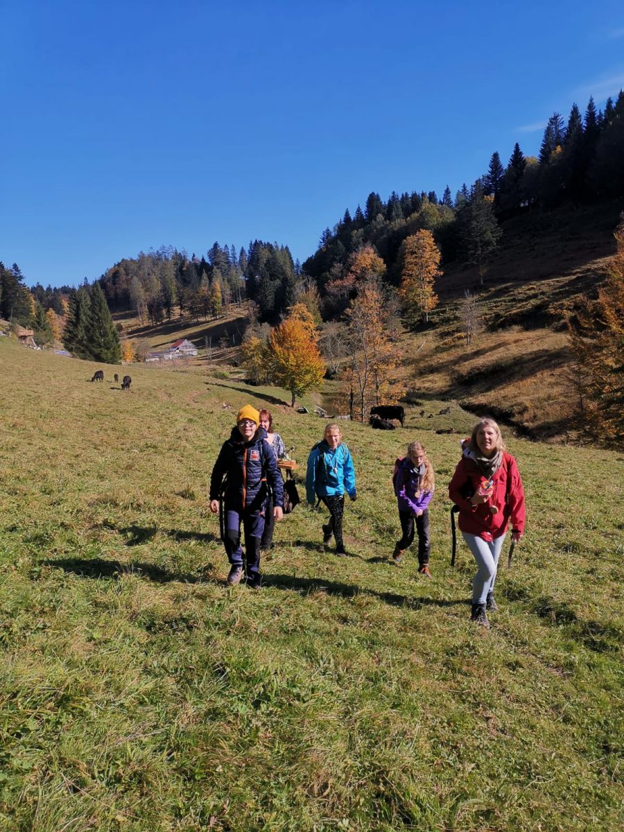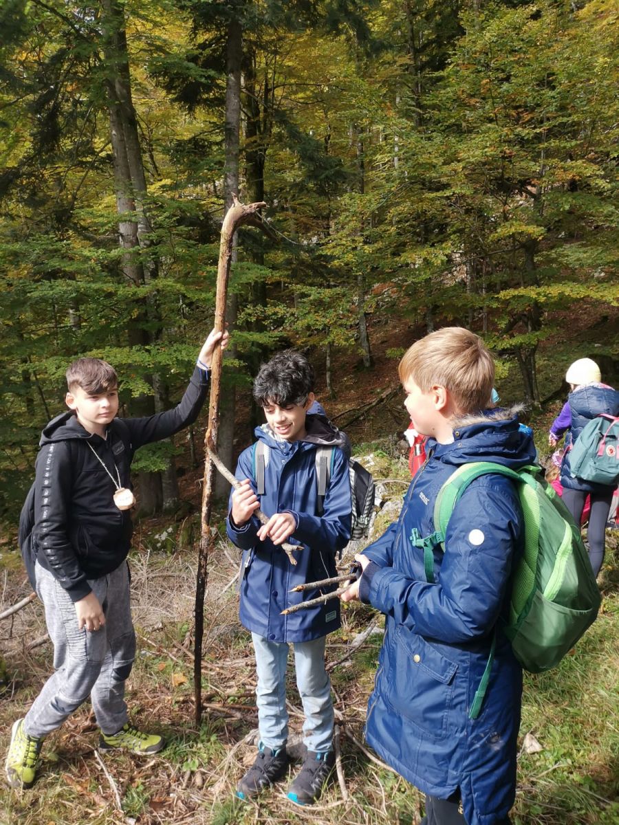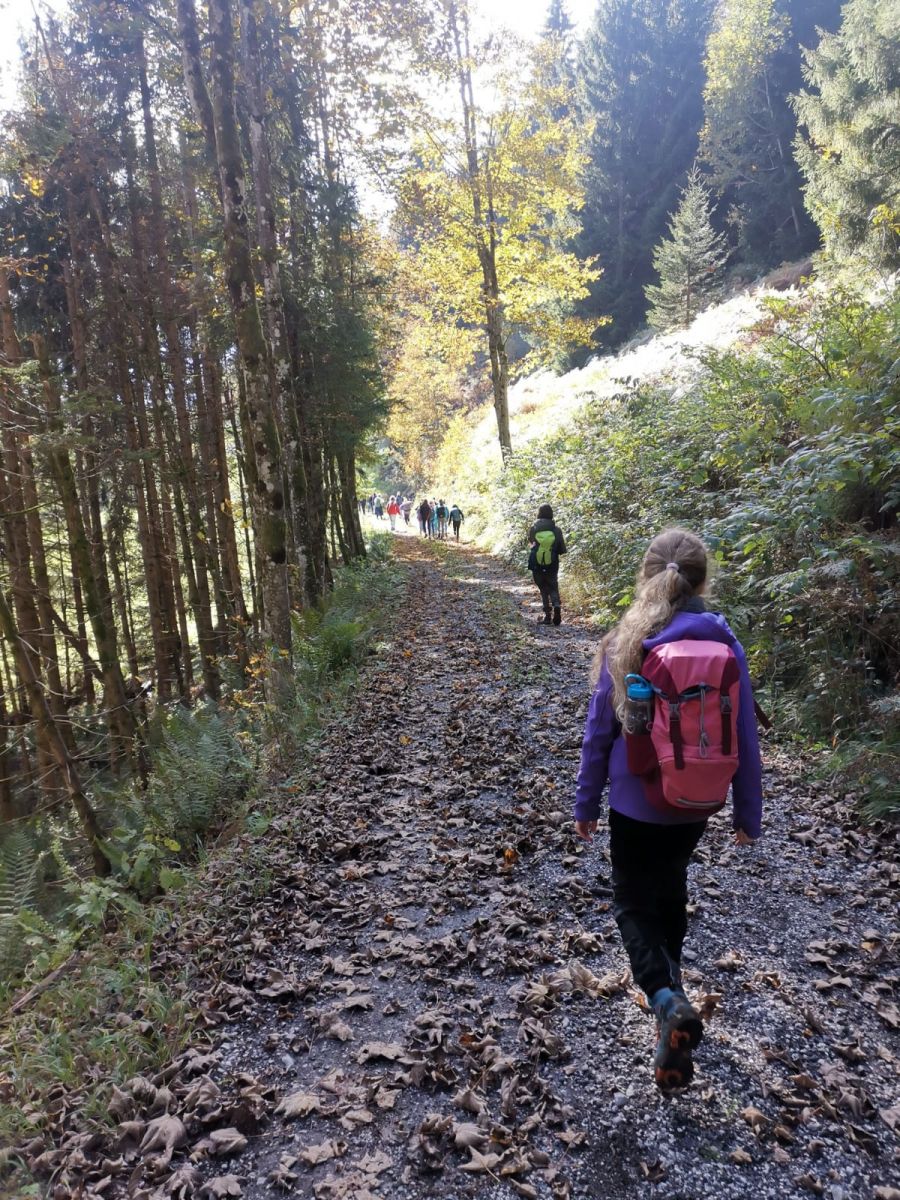 Rechtzeitig hatte der Herbst am 6. Oktober auf golden gedreht: Beim Waldtag der 2. Klasse in der Nähe von St. Koloman erfuhren wir nicht nur Delikates über Tief- und Flachwurzler, Farne und anderes Kraut, nein auch Geschichtliches wurde serviert, denn Nicolas Cage kam vor ein paar Jahren dort vorbei, wo unser Waldpädagoge und unsere Waldpädagogin ihr Anwesen haben. „Die Felsblöcke mit dem Moos drauf, das entspricht genau der Atmosphäre des 14. Jahrhundert. Wunderschön und mystisch“, so wurde uns Cage zitiert und wir konnten für Momente den Wagen vorbeirauschen sehen mit den sechs Pferden und dem Käfig hinten drauf mit der Hexe darin. Später durften wir einen kleinen Scheiterhaufen entzünden und trotz der Feuchtigkeit der vergangen Tage konnten wir schließlich unsere mitgebrachten Köstlichkeiten garen.