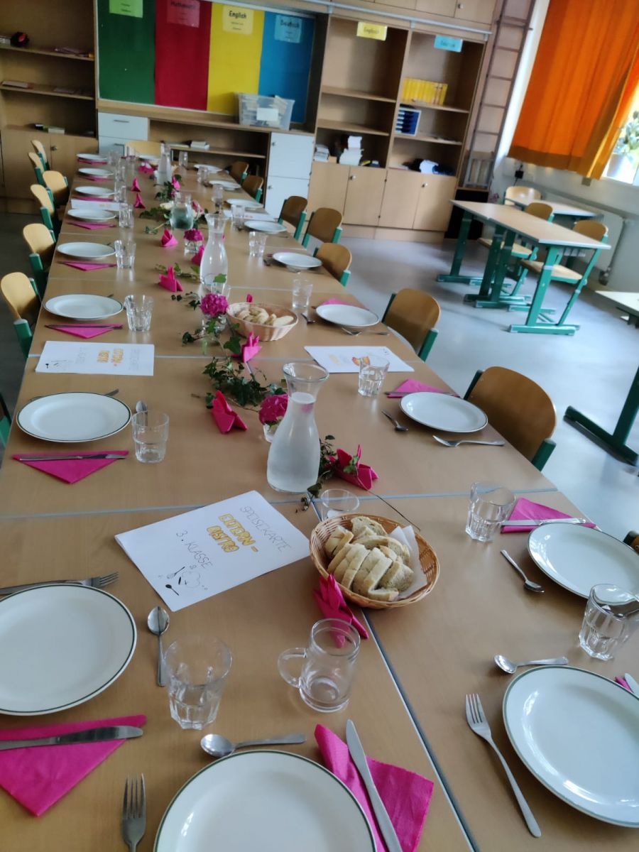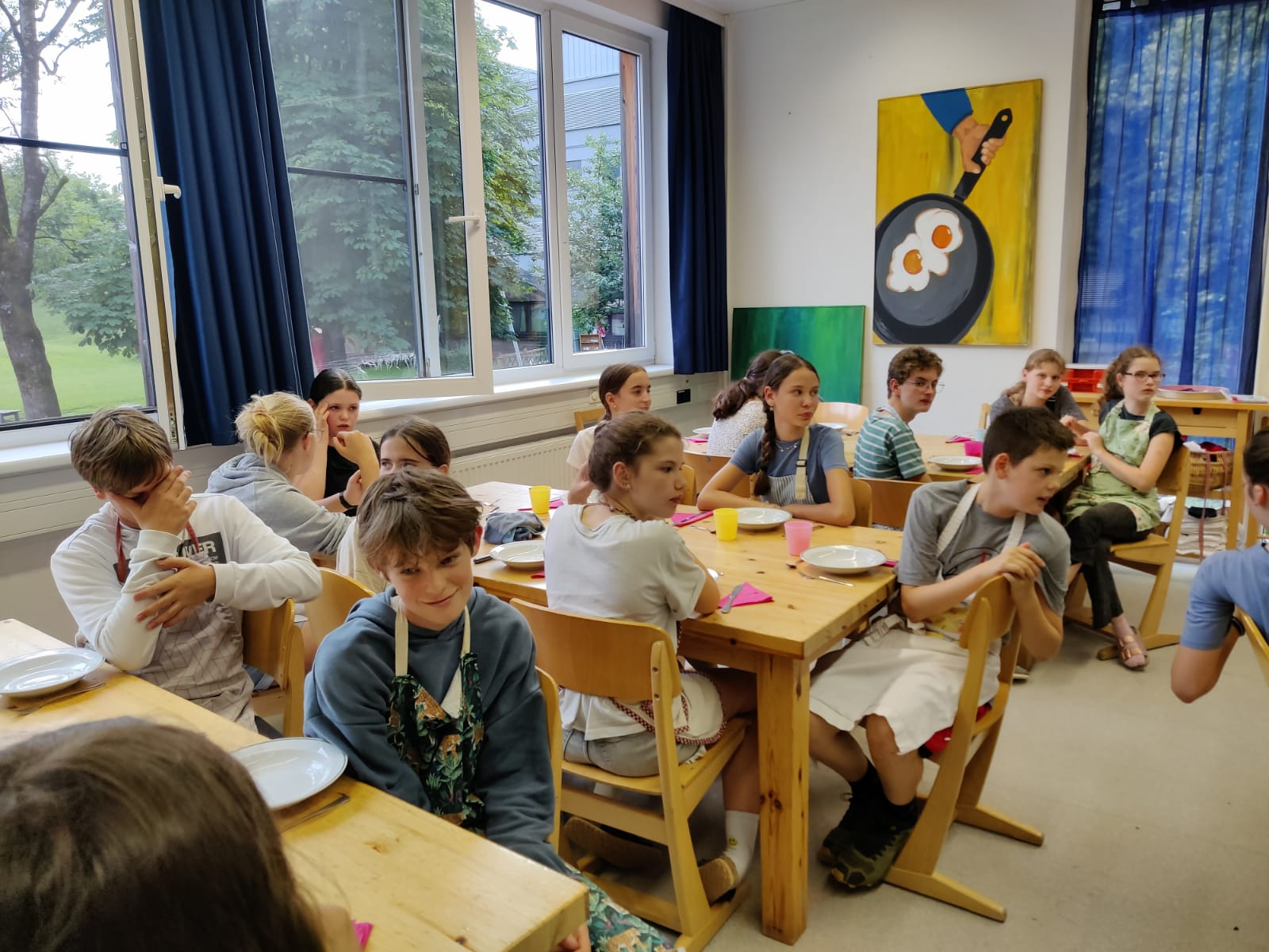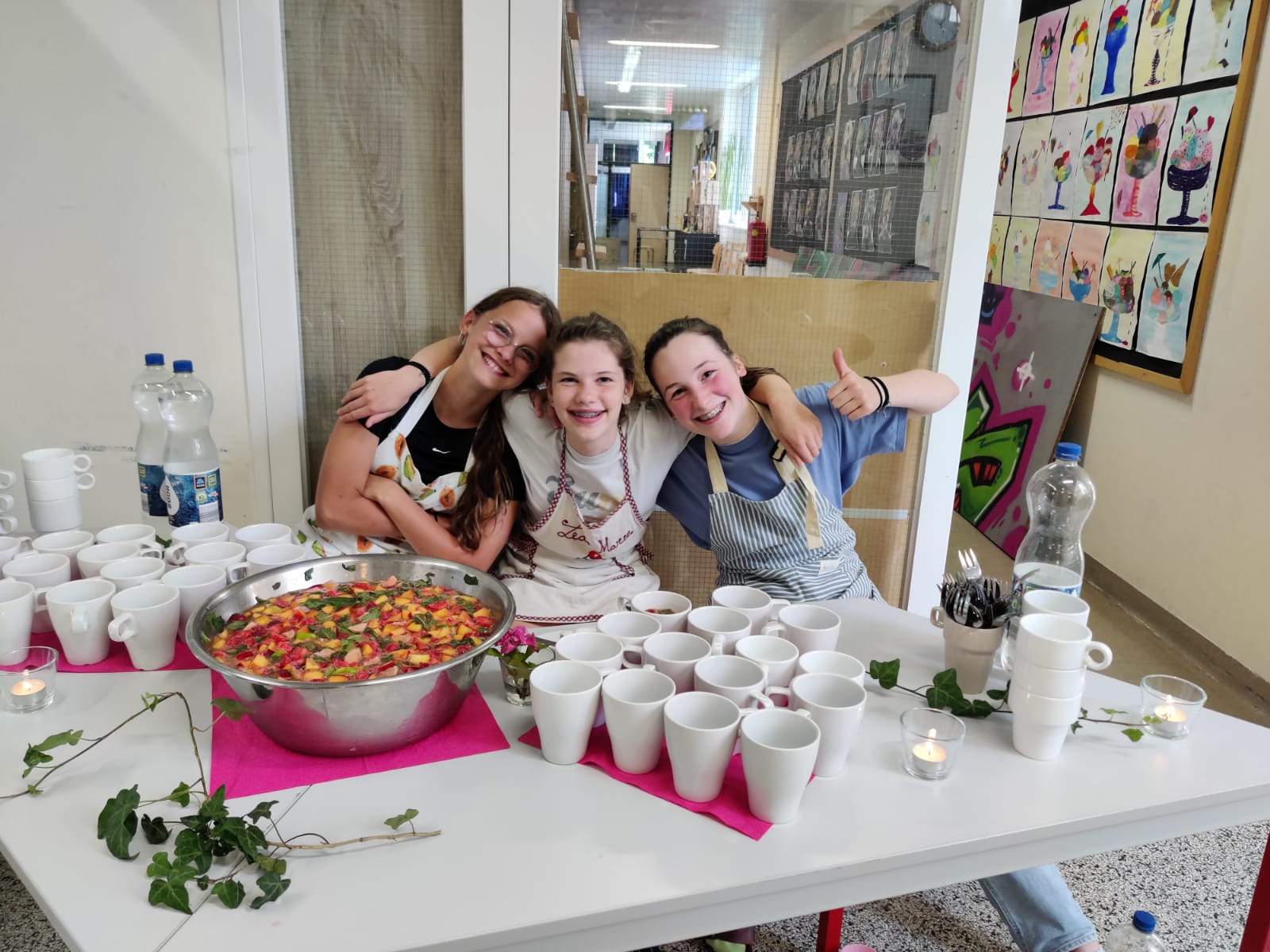 Während dem Schuljahr konnten die Schülerinnen und Schüler der 3. Klasse bereits an ihren Fähigkeiten zum Kochen und Servieren im Rahmen des Unterrichts im Fach Ernährung und Haushalt arbeiten. Am Donnerstag in der vorletzten Schulwoche wurden die Eltern mit einem mehrgängigen Menü verwöhnt. Davor gab es noch einen fruchtigen Aperitif zum Empfang.