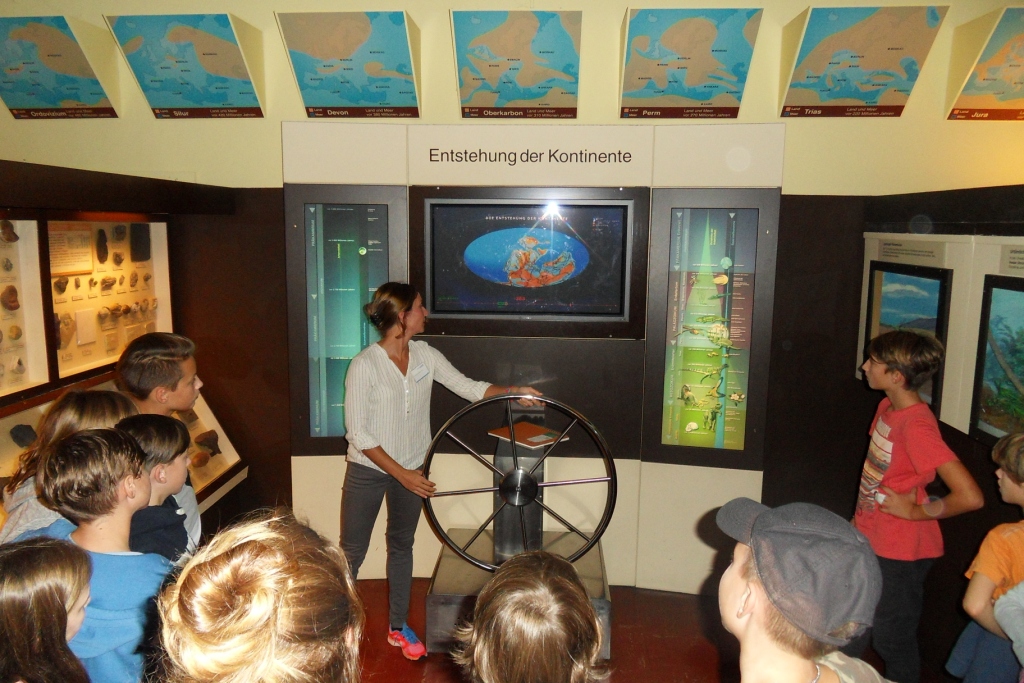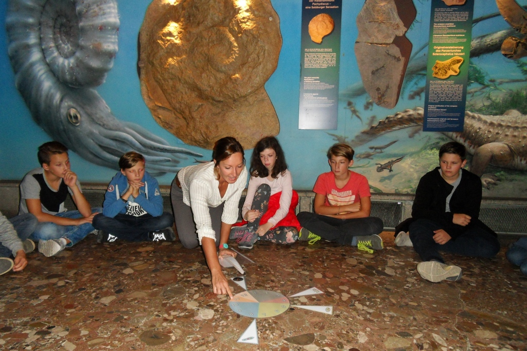 Beleuchtet wurde dabei die Entstehung der Erde aus geografischer und biologischer Sicht. Martina Winkler vom Haus der Natur veranschaulichte den Schüler/innen die Evolution der Lebewesen und die Bewegungen der Kontinente in den vergangenen 750 Millionen Jahren. Am sogenannten Zeitrad wagten die Schüler/innen auch einen Blick in die Zukunft. Dabei konnten sie feststellen, dass sich in ferner Zukunft alle sieben Kontinente zu einem „Superkontinent“ vereinen.