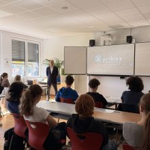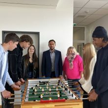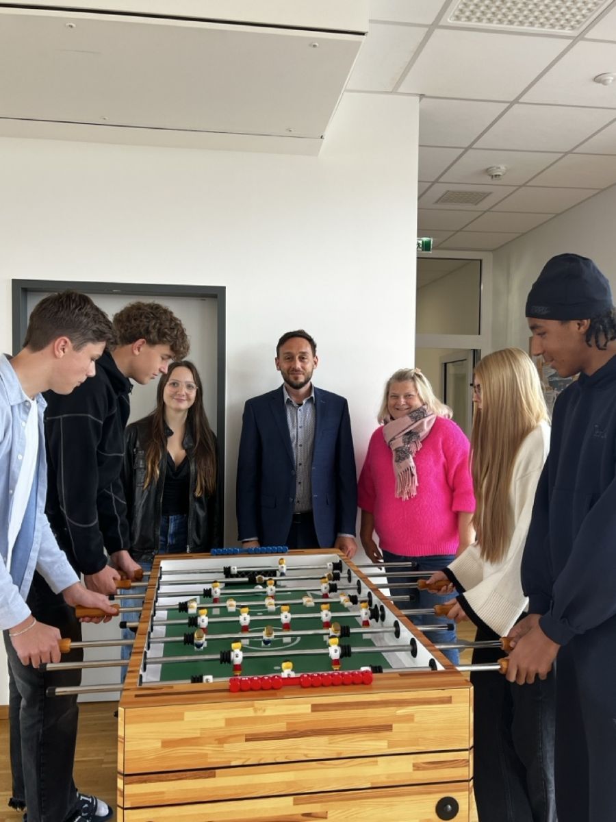 ElternvereinsobfrauNadine Försterübergibt derSchüler*innen-Vertretung des MORGden neuen Wuzzler, der noch auf Anfrage der Schüler*innen-Vertretung aus dem letzten Schuljahr über den Sommer angeschafft wurde.