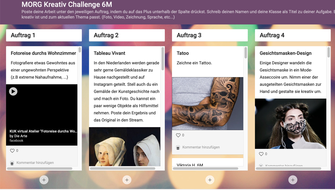 KREATIVITÄT GOES DIGITAL! Die MORG Kreativ Challenge in den Fächern Bildnerische Erziehung und Bildnerisches Gestalten und Werkerziehung fordert die SchülerInnen aktuell tagtäglich mit einem neuen Auftrag zum kreativen Arbeiten und bildnerischen Gesalten heraus.