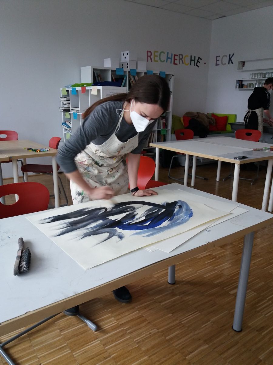 Es wurde geschüttet, gespritzt und getropft, die Farbe gestreichelt, hineingestiegen und ordentlich dick aufgetragen. Ein Farb- und Malexperiment, das nicht nur die Schüler, sondern auch unsere SPF Lehrerin Frau Leitner zum Mitmachen verleitete.