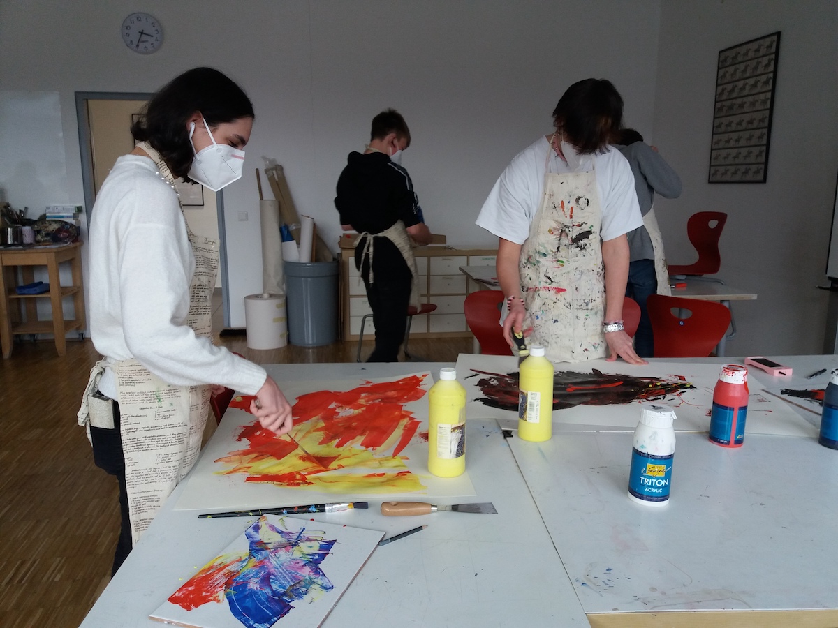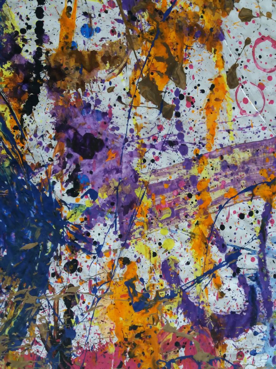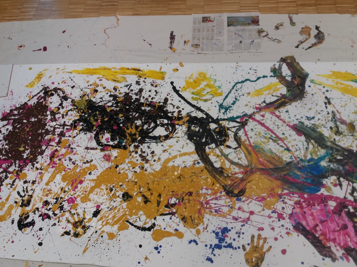 Anfänglich wurden unterschiedliche Musikstücke in abstrakt-expressiver Malweise umgesetzt, um schließlich ein großformatiges Bild á la Jackson Pollock entstehen zu lassen.