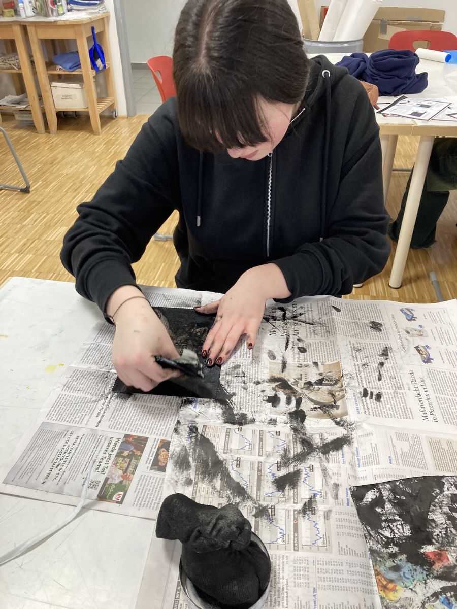 Die Schüler:innen der 5M beschäftigten sich im Jänner mit Druckgrafik. Mit Hilfe der Technik der Kaltnadelradierung erarbeiteten sie Illustrationen zu Morden aus Geschichten von Edgar Ellen Poe.