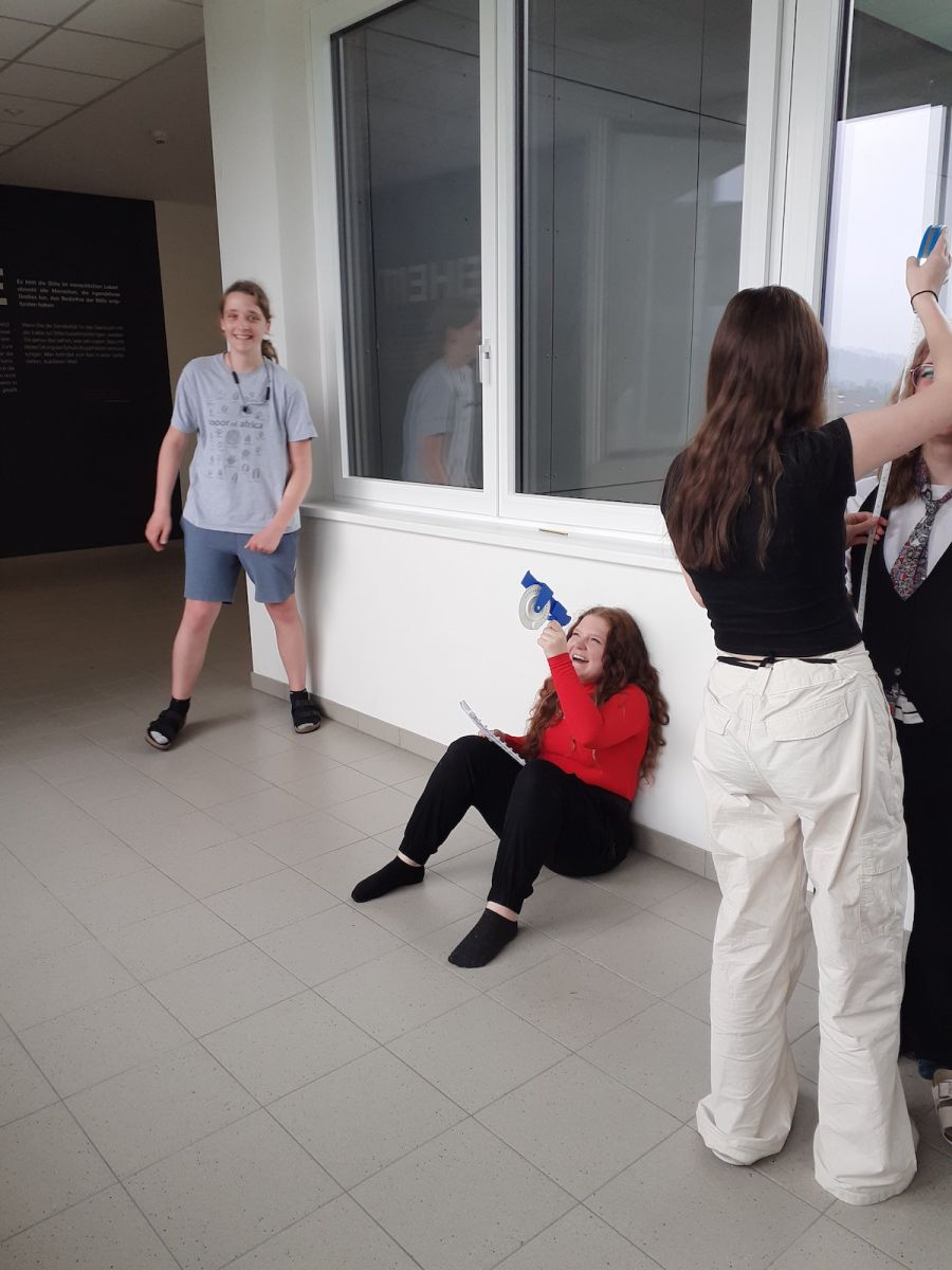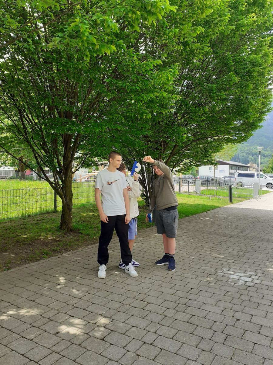 Im Förderkurs konnten die Schülerinnen und Schüler den Umgang mit einem Clinometer erproben. Die Jugendlichen sollten die Höhe des Schulgebäudes und die Höhe der Fenster mithilfe der Trigonometrie ermitteln. Zuerst mussten sie einige Messaufgaben (die horizontale Entfernung, die Größe der messenden Person) vornehmen. Mit dem Clinometer wurde dann der Winkel bis zur oberen Kante des Gegenstandes oder Gebäudes bestimmt. Mit diesen Angaben konnten die Schülerinnen und Schüler eine Skizze erstellen und die fehlenden Höhen mit Sinus, Cosinus oder Tangens berechnen.