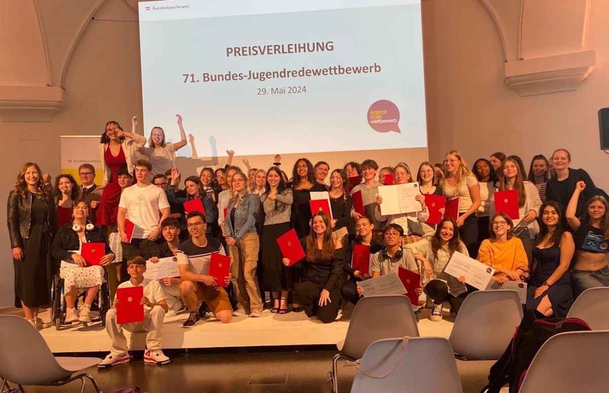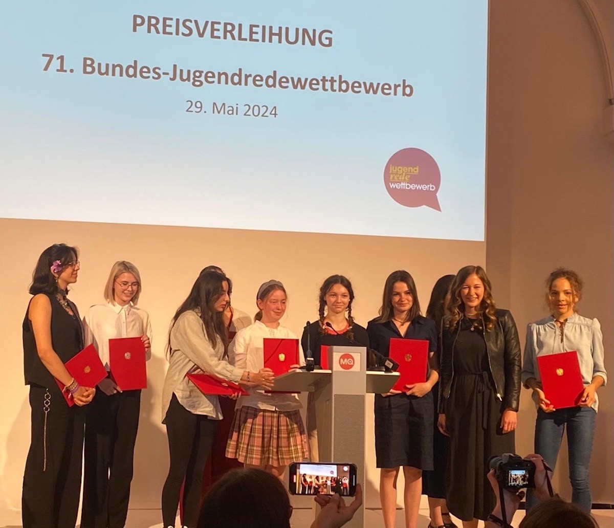 Die Regeln waren die gleichen wie beim Landesausscheid. Gemeinsam mit den Landessiegern der anderen Kategorien (Spontanrede, Klassische Rede Berufsschulen, -Höhere Schulen, sowie -8. Schulstufe) traten wir in unseren Kategorien gegen die Sieger aus den anderen Bundesländern an. Der Themenpool war riesig und reichte von Frauenrechten und Feminismus bis zum Thema KI oder Vorurteile gegenüber der Generation Z. Alles Themen, die junge Menschen derzeit interessieren und beschäftigen.