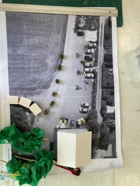 Fünf Gruppen, die nun an der (Um-) Gestaltung der ausgewählten Orte arbeiteten (was wäre, wenn…). Als Material standen 1:100 Bebauungspläne, Fotos der Orte von unterschiedlichen Perspektiven, A3 Farbausdrucke der bestehenden Bebauung, Foamboards, Menschen im Maßstab 1:100 als Referenzgröße und jede Menge Modellbaumaterial (Moos, Papier, Holz,…)zur Verfügung