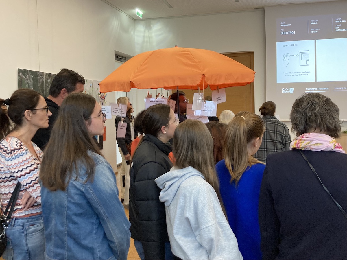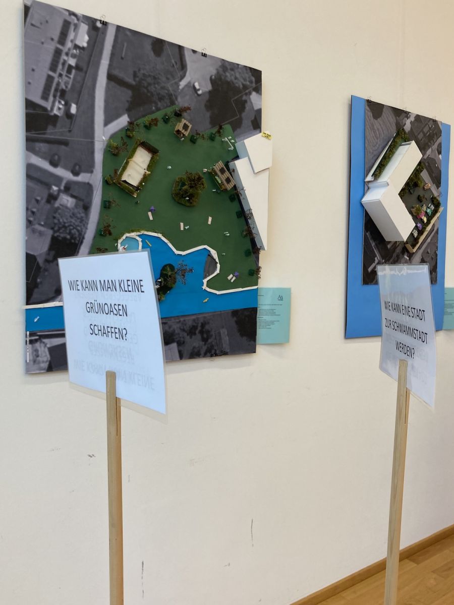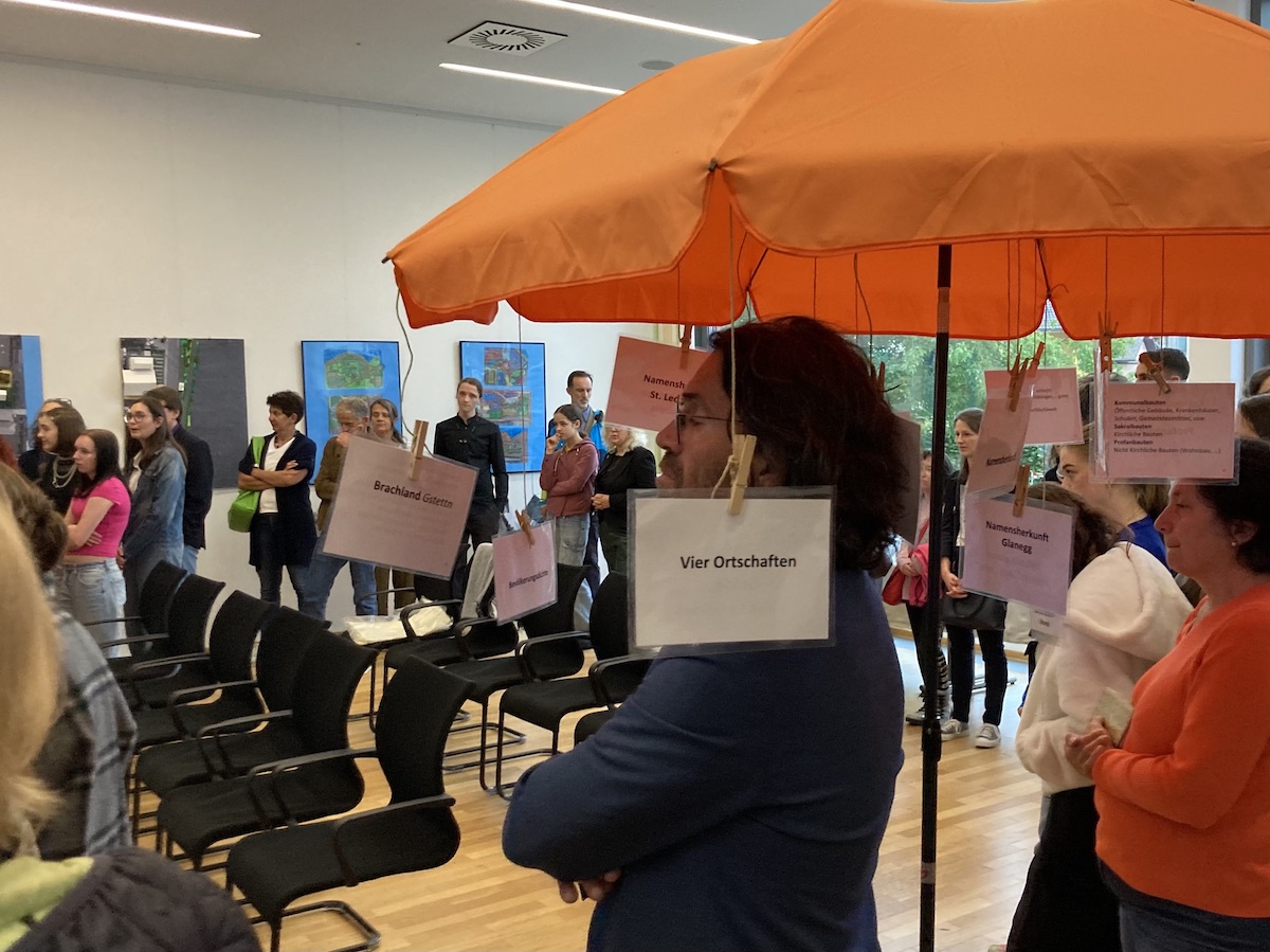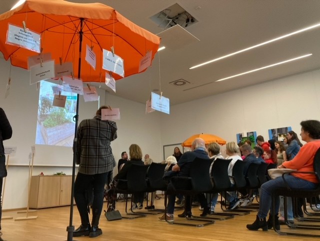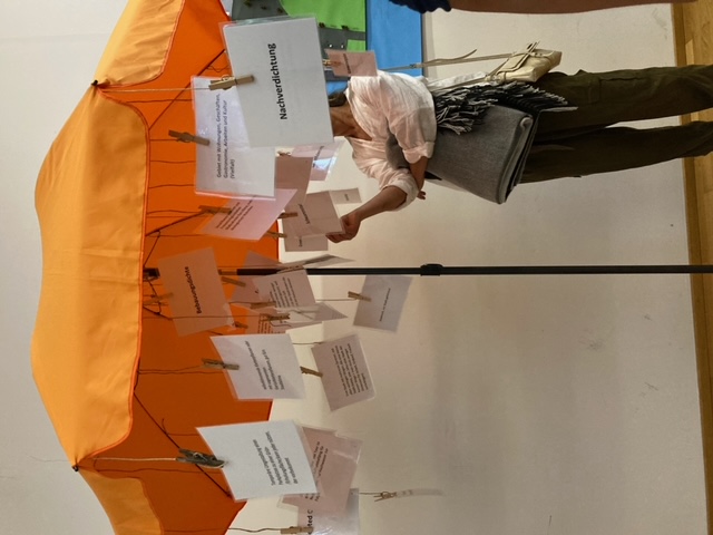 - Zwei Sonnenschirme behängt mit 35 laminierten Architektur-Begriffen und deren Erklärung (Verkehrswende, Entsiegelung, Schwammstadt, …)