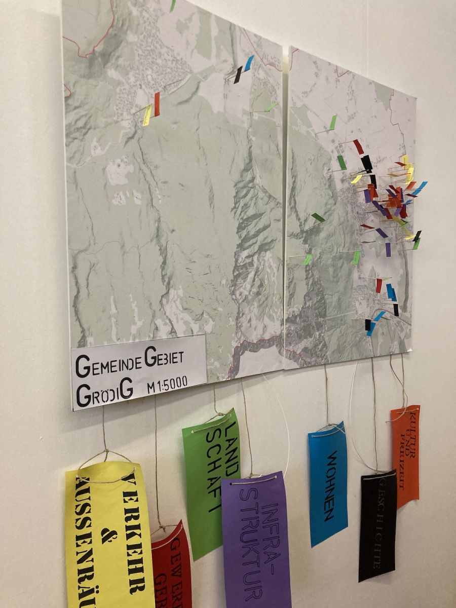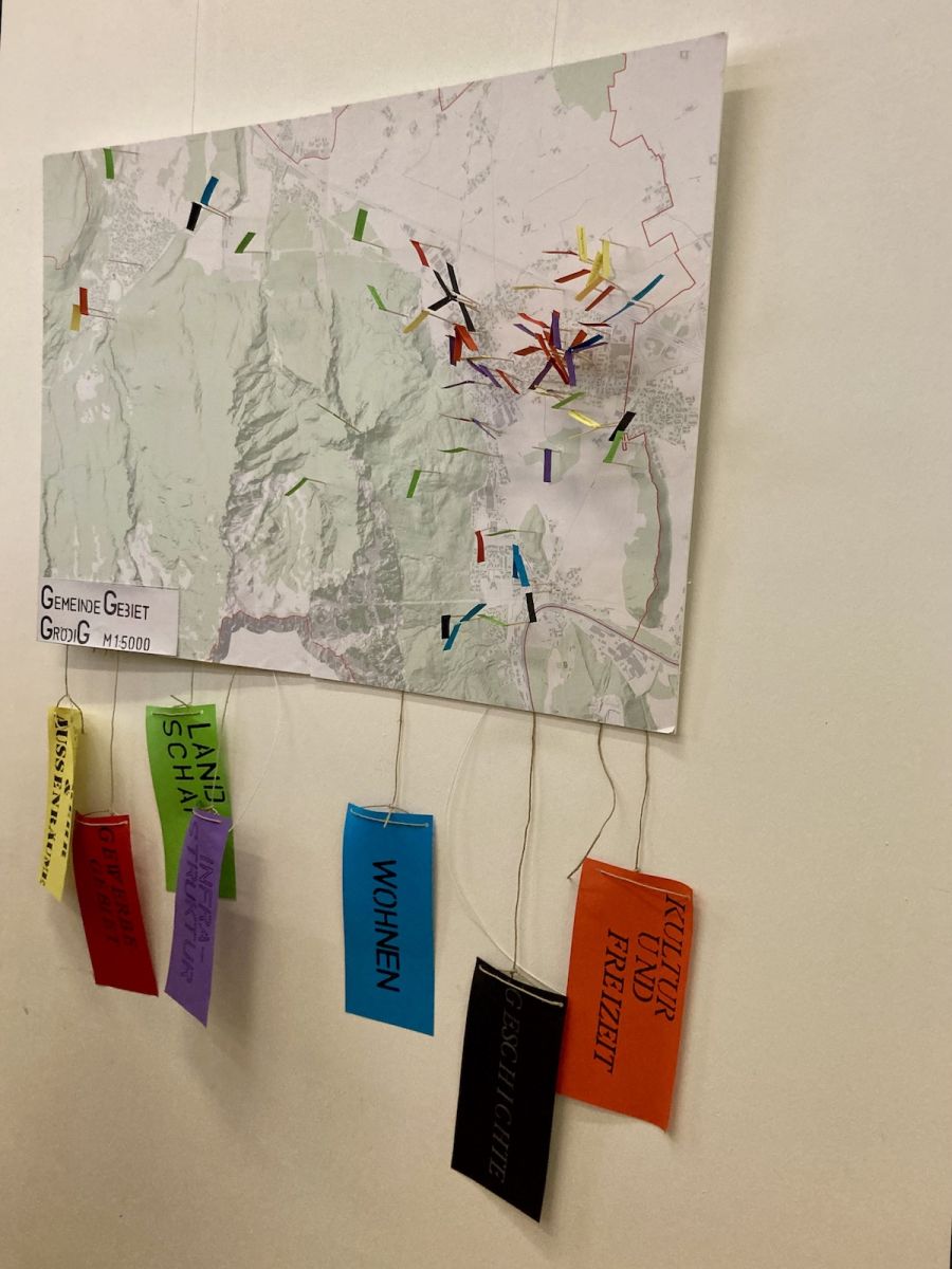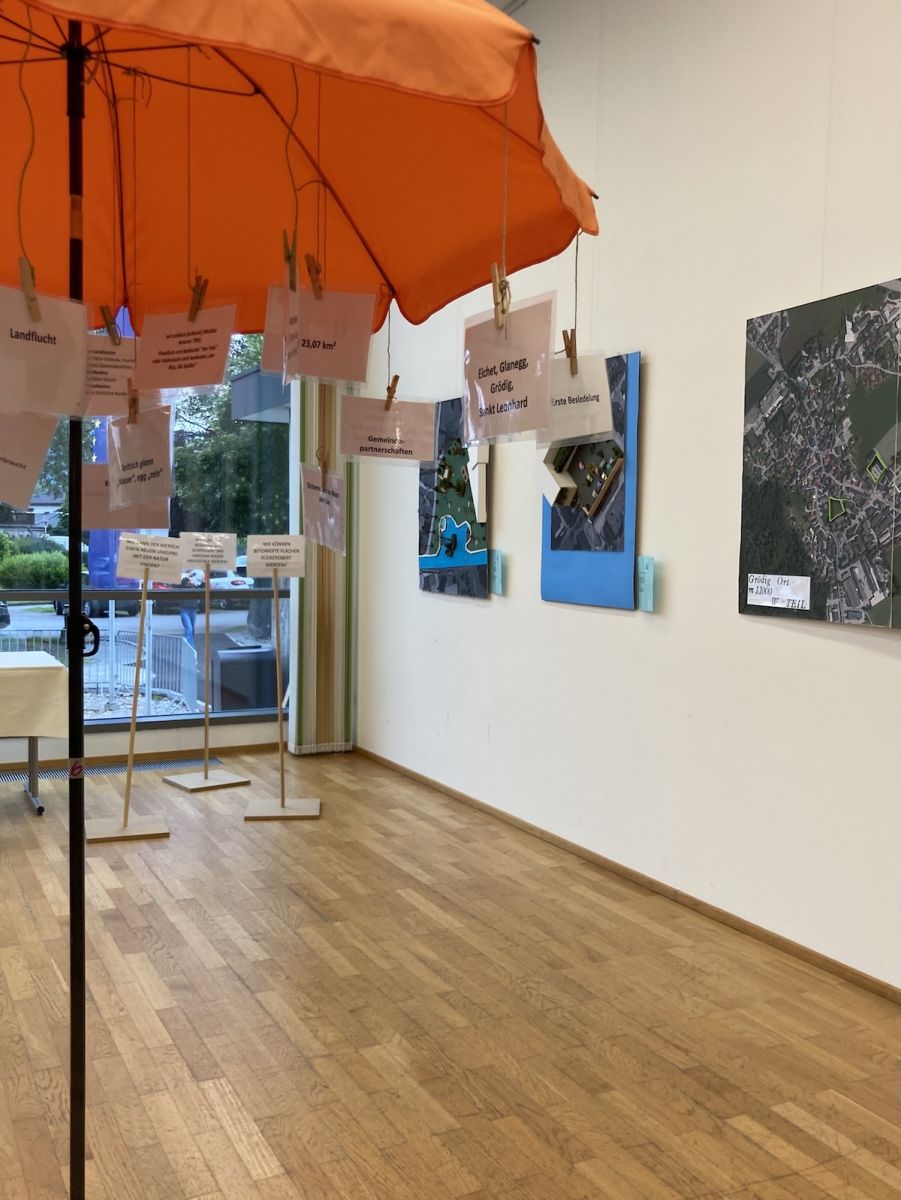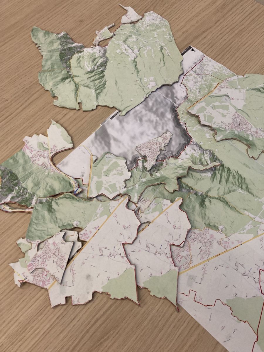 - Ein Tisch mit einem „Gemeide-Puzzle“: das Gemeindegebiet aufgeteilt in die fünf Bezirke