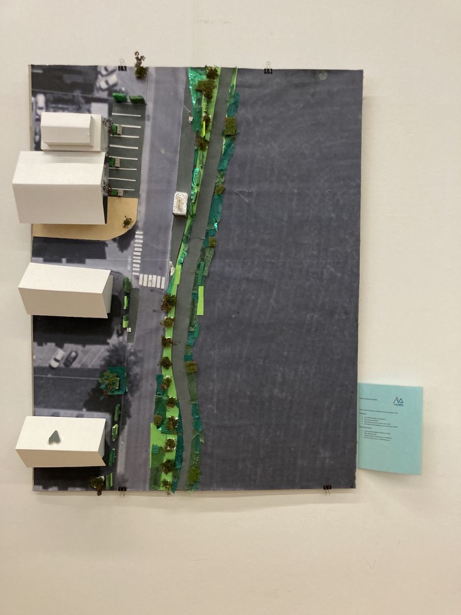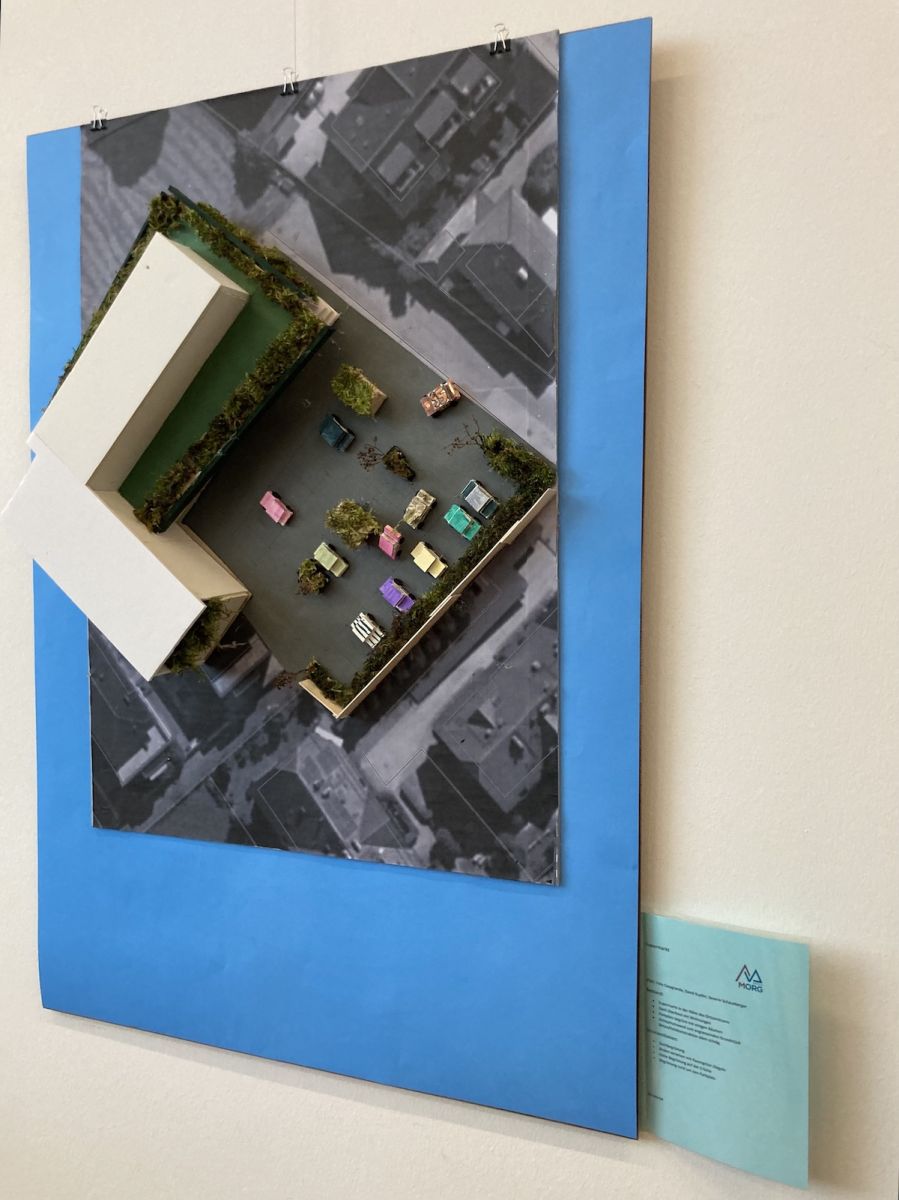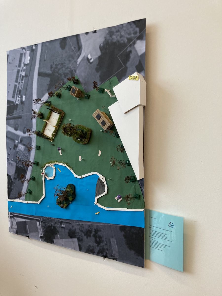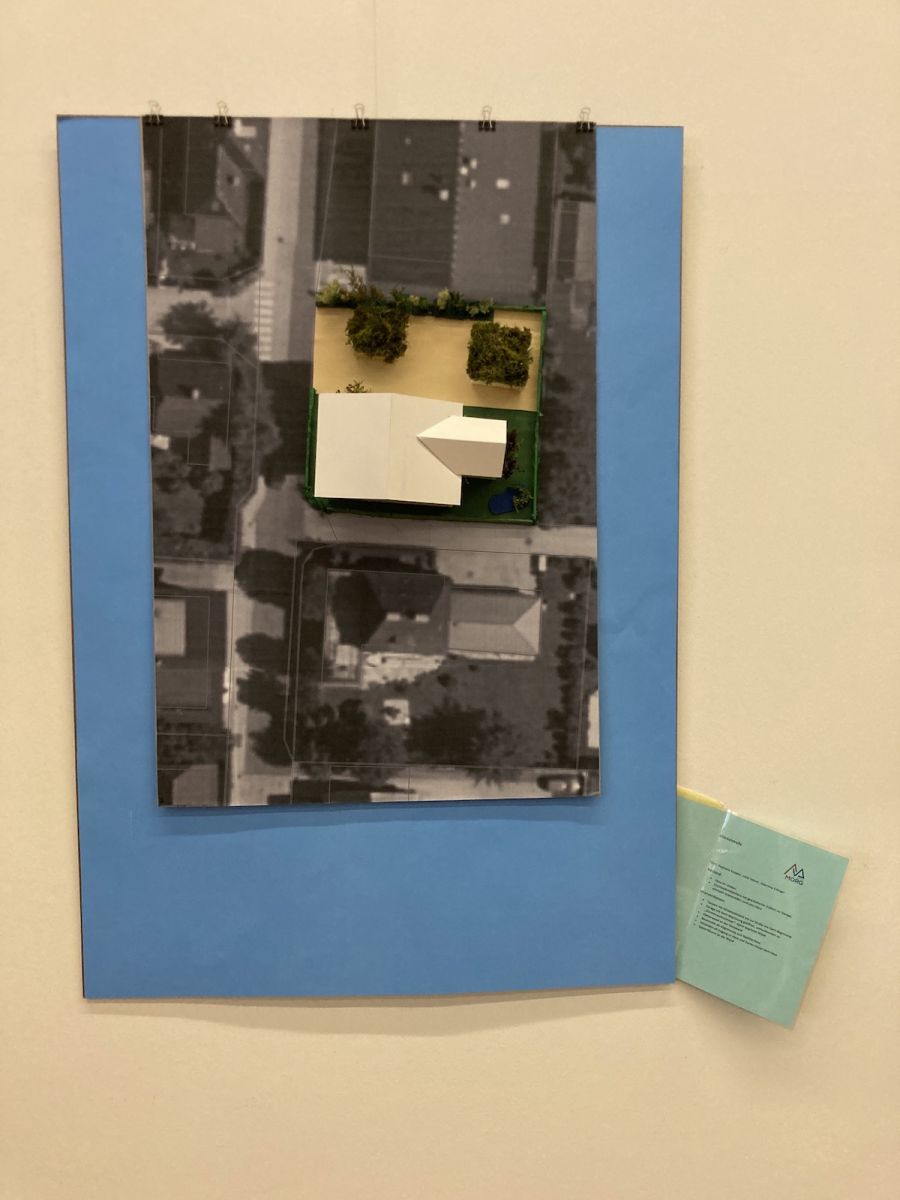 Kartonuntergründe, mit 1:100 Lageplan kaschiert, wurden mit den Modellen versehen und auf Bilderrahmen-Rückseiten montiert, sodass sie 90 ̊ gedreht aufgehängt werden konnten. Weiters zeigte die Ausstellung:
