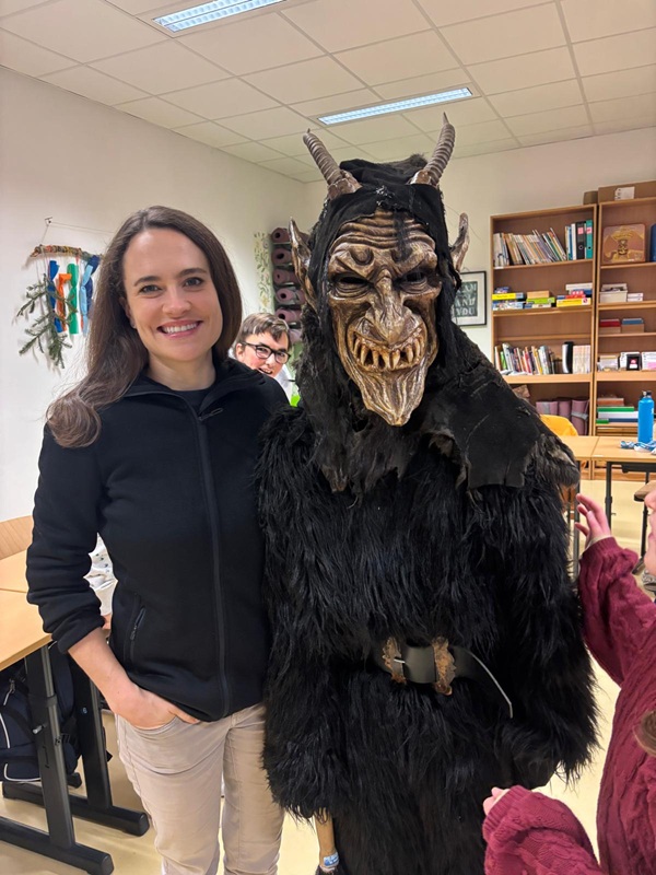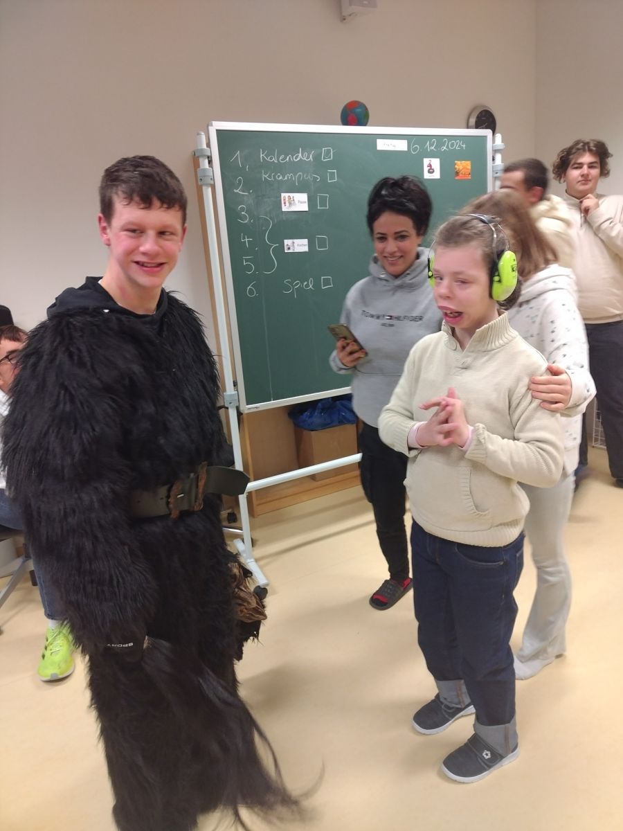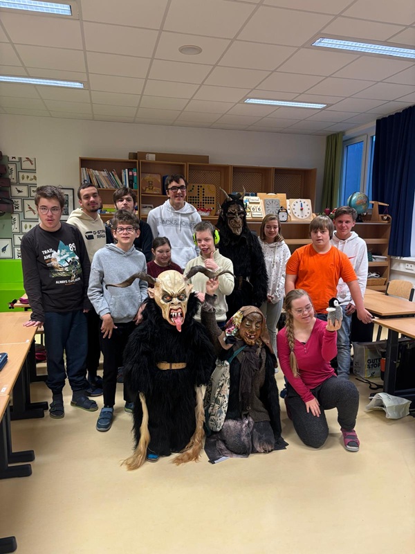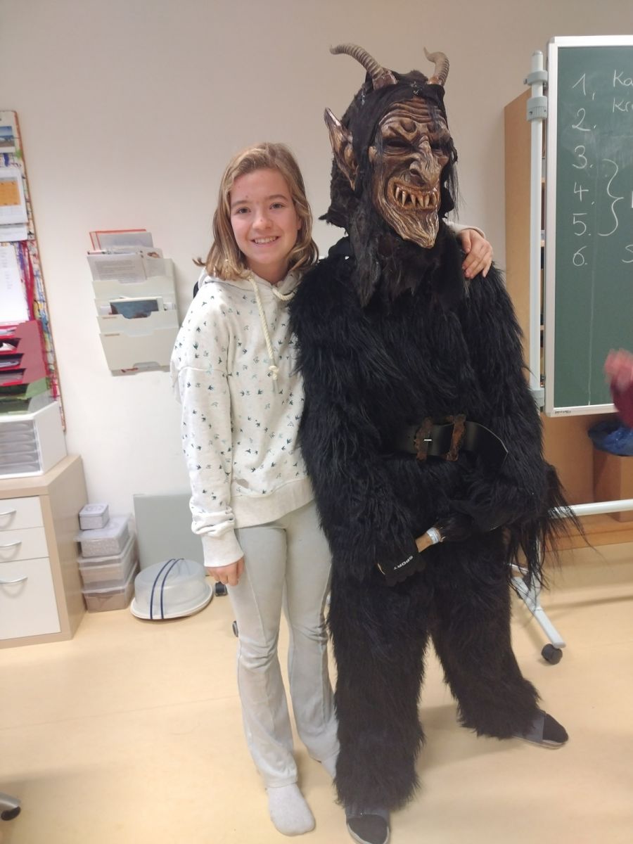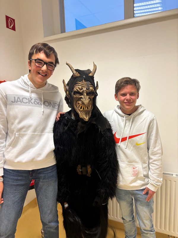 Leo hat gemeinsam mit zwei Schüler:innen der IMS allen Klassen einen Besuch abgestattet. Ein waschechtes Krampuskostüm mit beeindruckender Maske und Rute hat dabei nicht gefehlt.