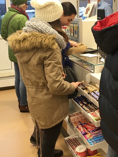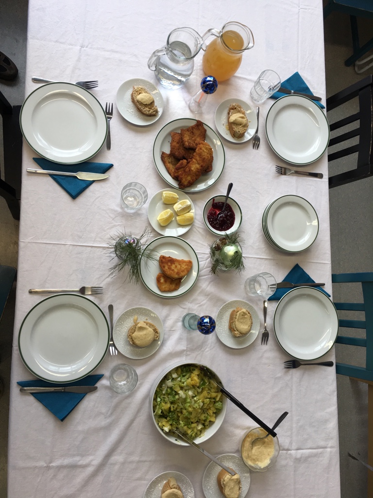 - Es gab ein wunderbares Weihnachtsessen mit Sellerie-, Puten- und "Fakeschnitzel", dazu Kartoffelsalat und eine weihnachtliche Roulade als Nachtisch.