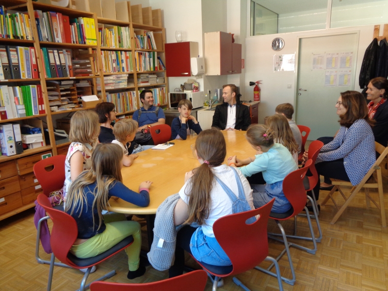 Vizebürgermeister Auinger hat unsere Schule besucht. Nach einem Rundgang durch die Ateliers hat er sich mit 8 Kindern zum Gespräch getroffen. Die Fragerunde war sehr angeregt und die Kinder waren begeistert, wie unkompliziert man mit ihm reden kann.