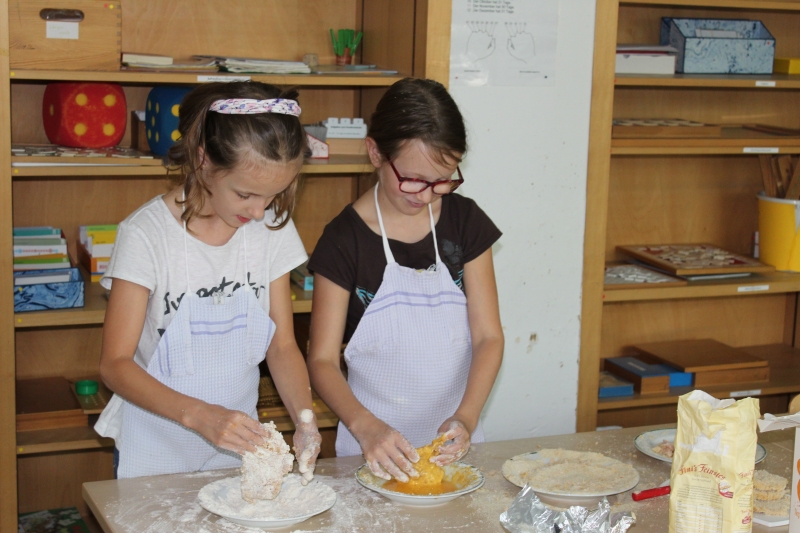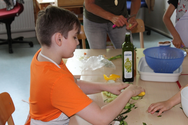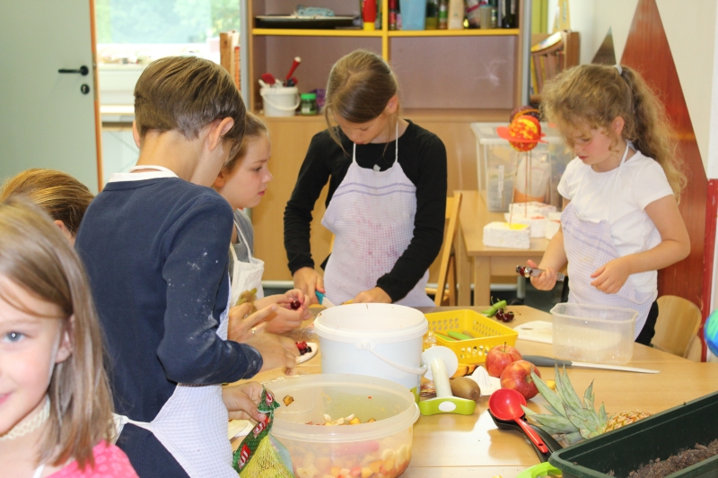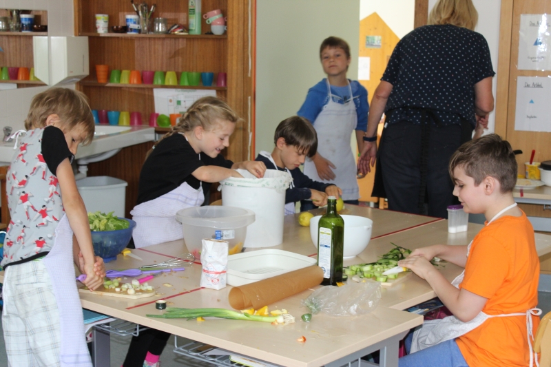 Im Atelier „Kochen“ wird geschnitten, gerührt, gebacken, gekostet und dann natürlich schön aufgedeckt und mit großem Vergnügen gegessen.