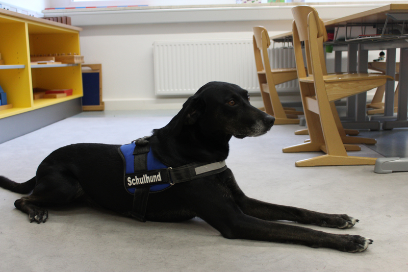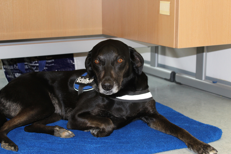 Unser Schulhund Lola ist ein schwarzer Mischling aus einem Bordercollie und Magyar Vizslar. Sie ist ein ausgebildeter Theraphiebegleithund. Sie ist ein zutraulicher Hund. Doch was macht sie jetzt im Unterricht? Naja! Während der Schmusezeit von 7.45 bis 7.55 darf Lola gestreichelt werden. In der Lesezeit von 7.55 bis 8.10 darf man ihr vorlesen. Während des Unterrichts liegt der Hund in der sogennanten „Box“.( Das ist ein mit Decke ausgepolsterter Bereich unter Christians Schreibtisch.)