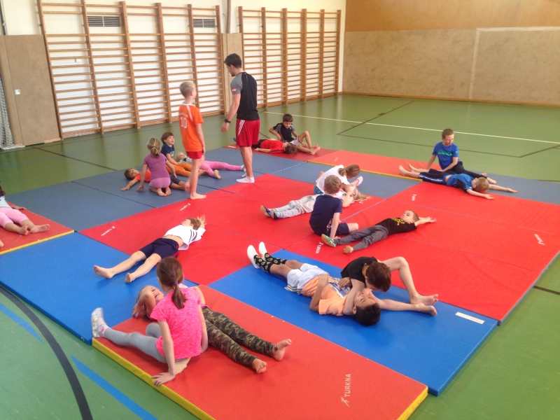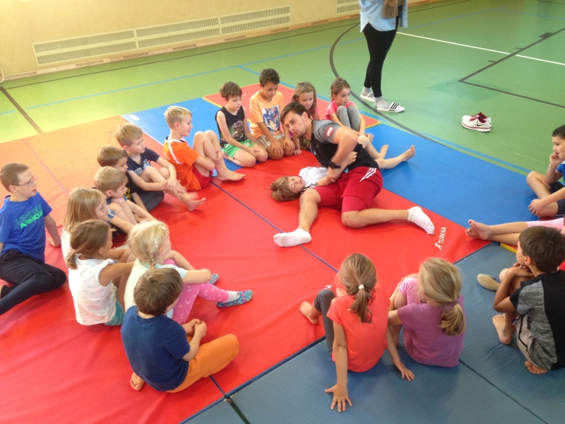 Seit drei Wochen besucht uns einmal in der Woche unser Turntrainer Stephen von Sportunion Salzburg. Er kommt vom Judo und zeigt uns ganz tolle Übungen. Zum Beispiel, wie man sich richtig abrollt, wenn man plötzlich hinfällt oder auch verschiedene Judo-Griffe. Dazu erklärt uns Stephen immer wichtige Aufwärmübungen, damit sich keiner weh tut.